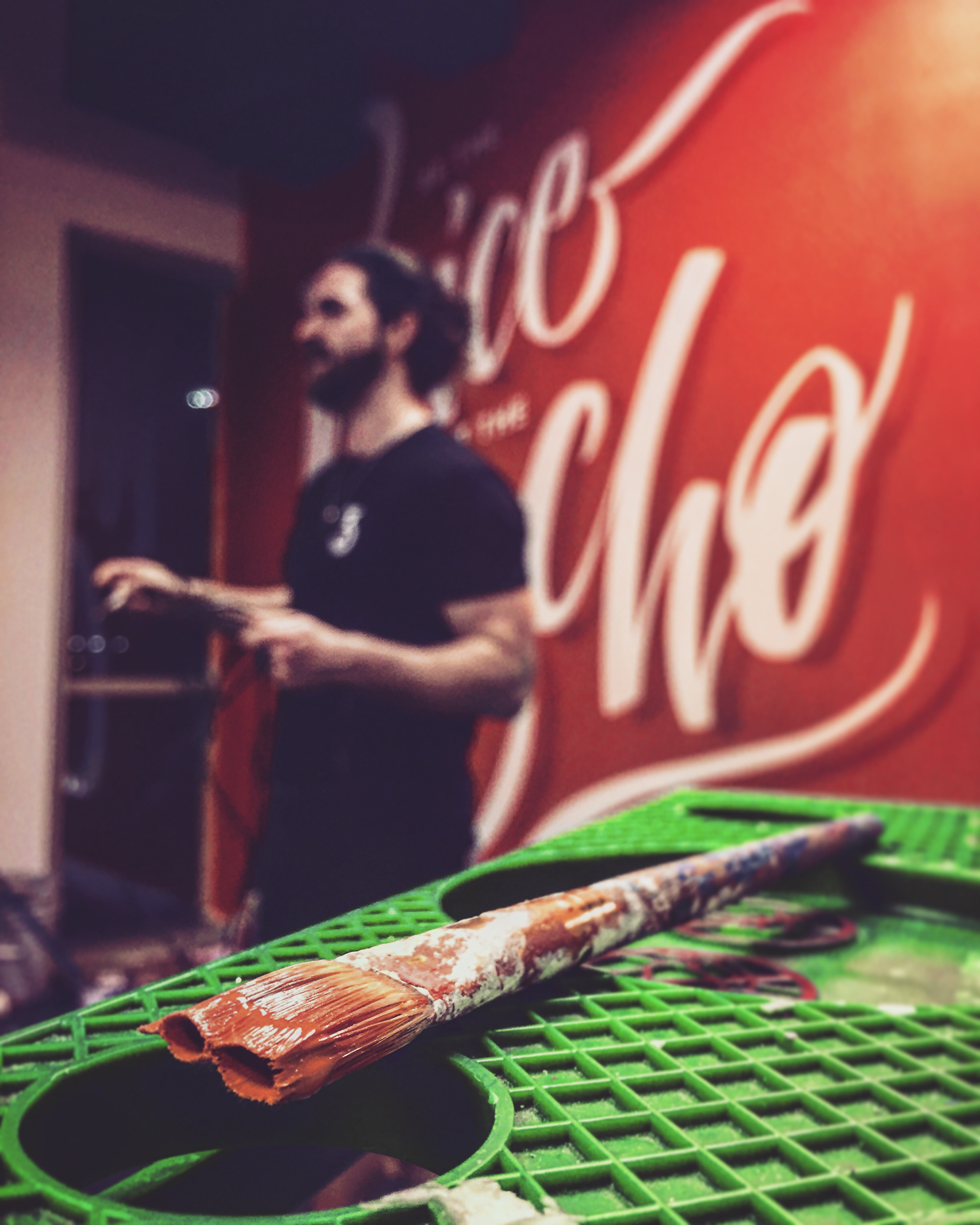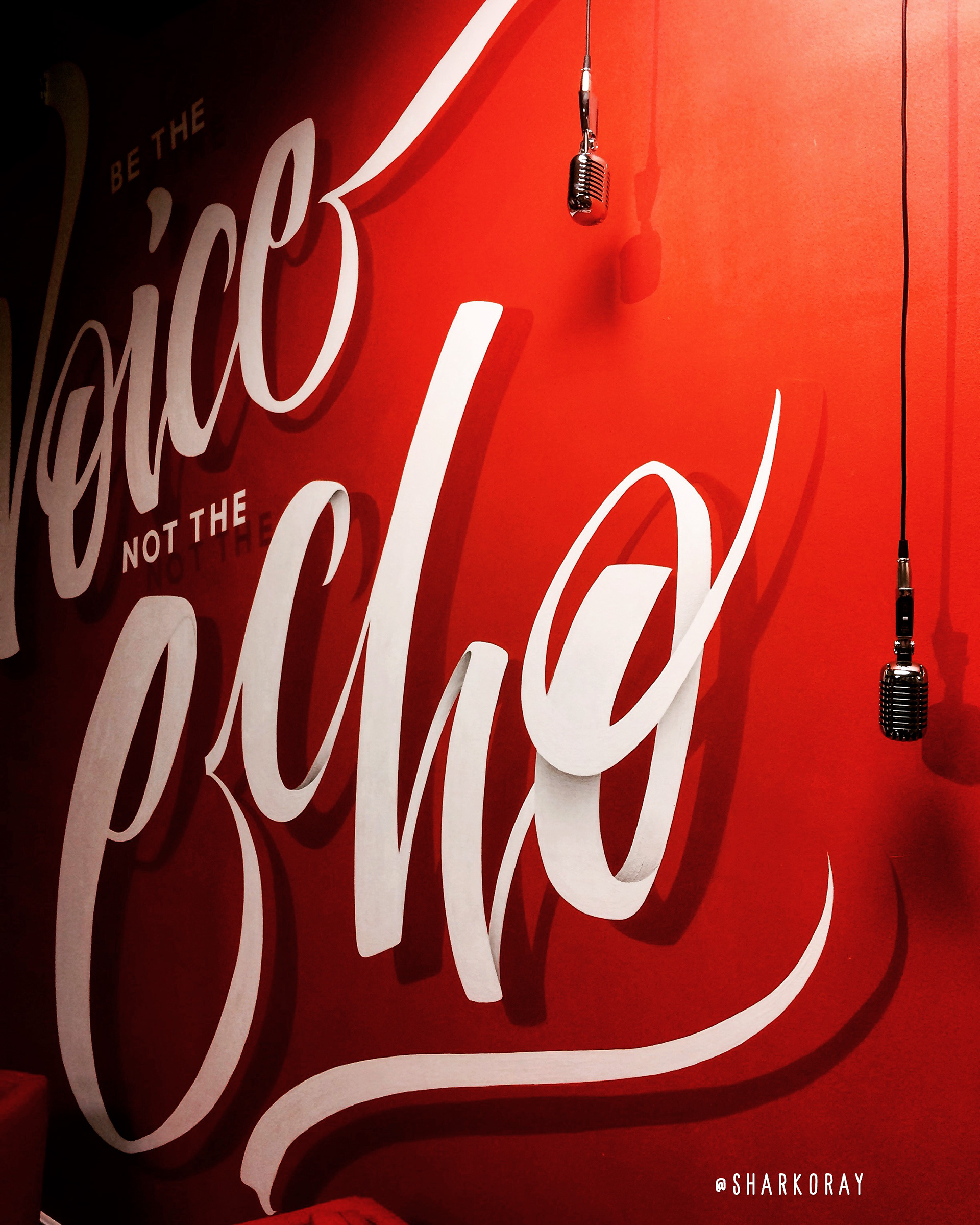 After creating the custom script font came the idea to install the vintage microphones that would hang from the ceiling with painted shadows placed behind them. The novelty of the installment was that they were going to be functional in the event of a big announcement, or perhaps a spark of genius that deserved to be said loud and proud.